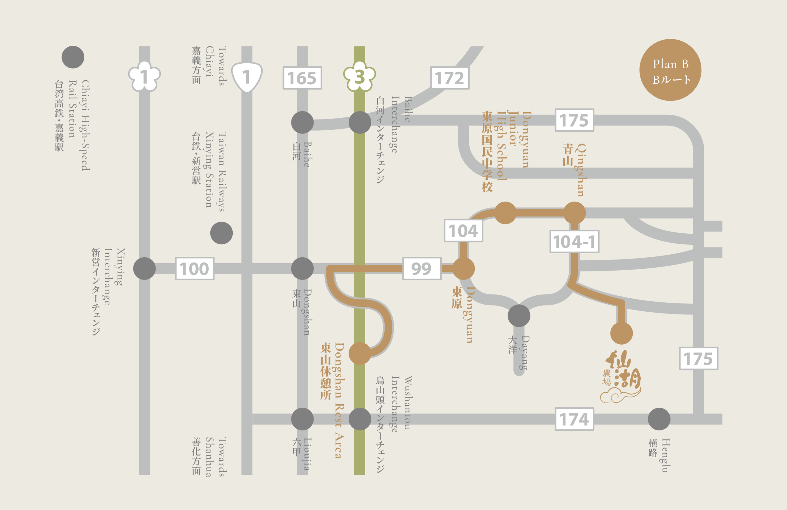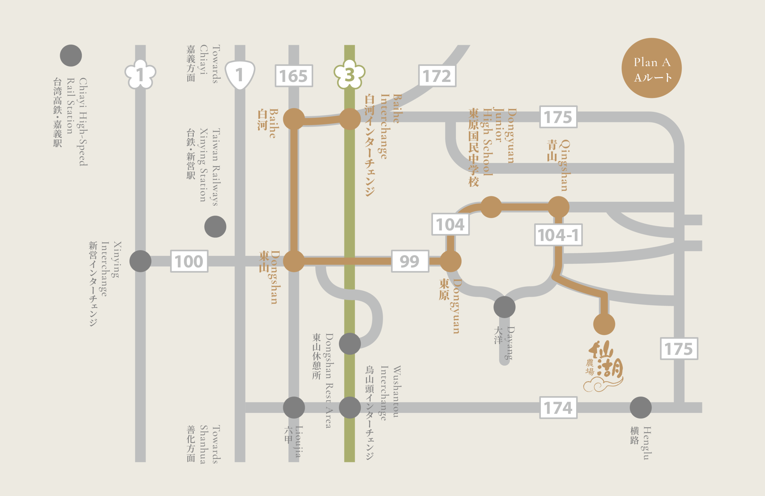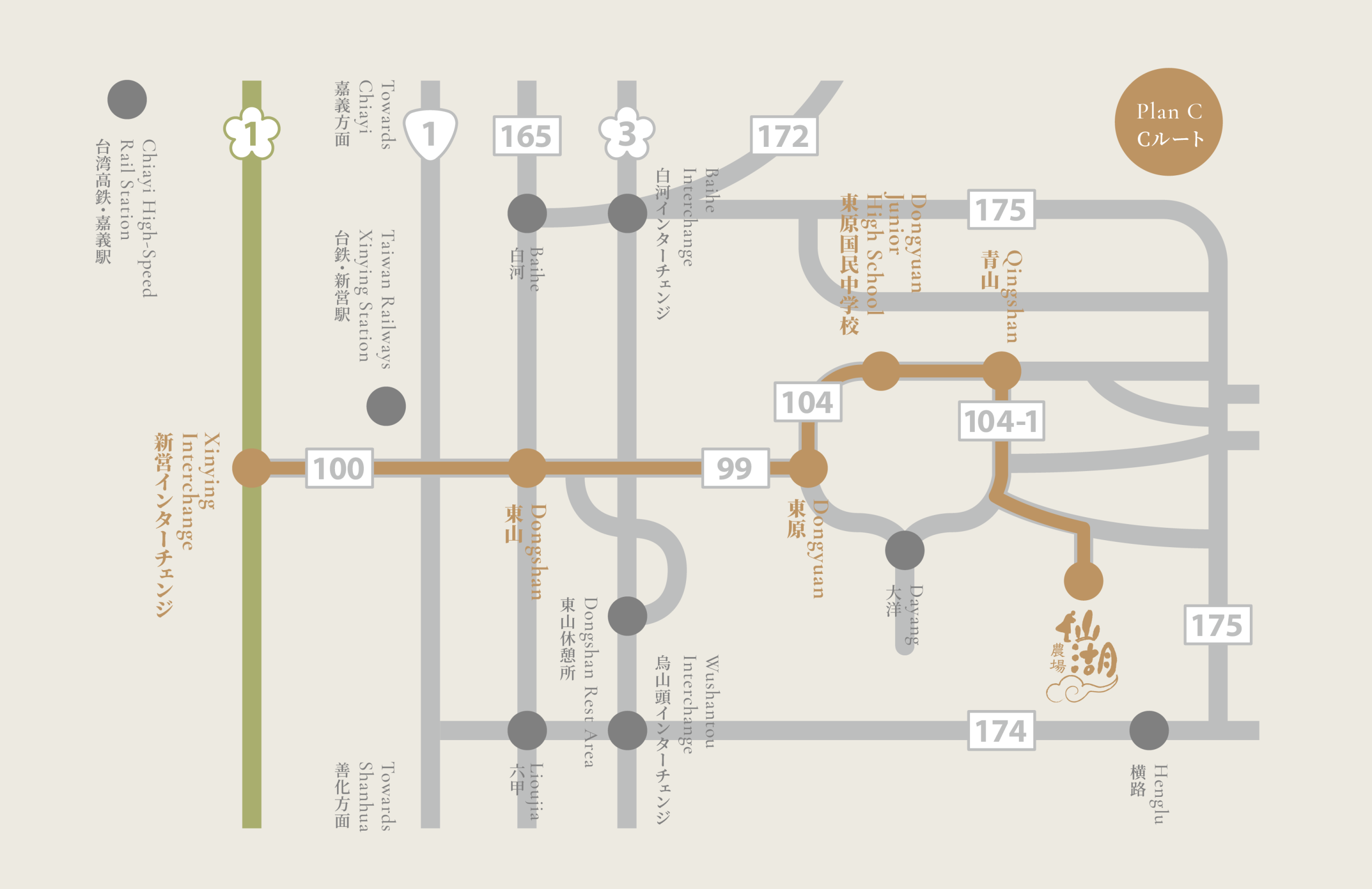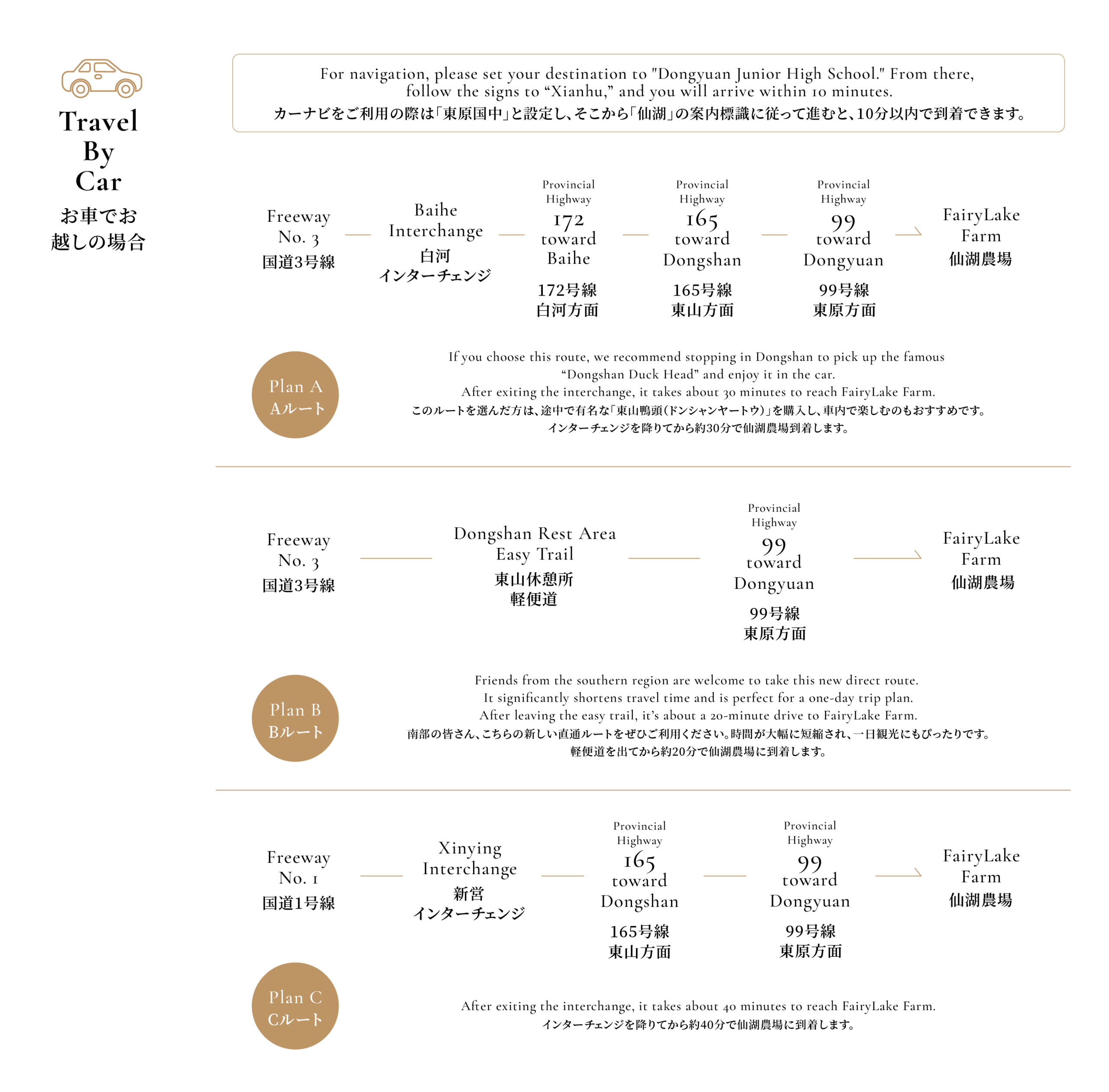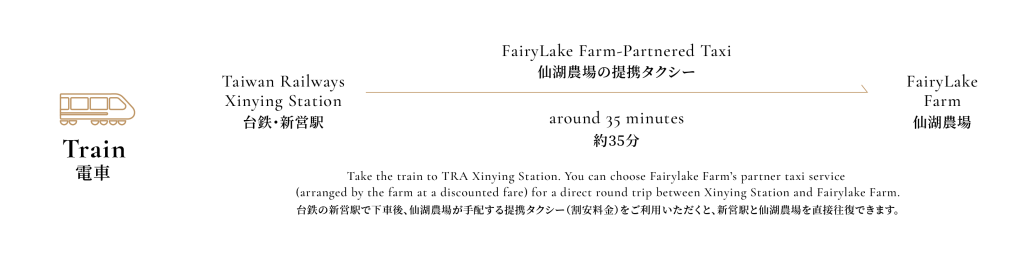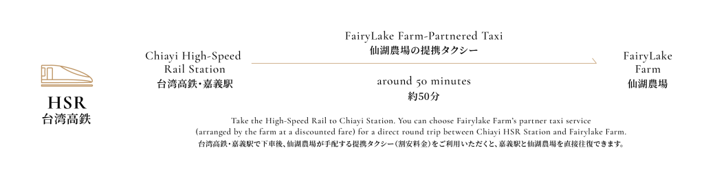 Senwho Leisure Farm is located in Dongshan, Tainan. From Taoyuan International Airport, the journey takes approximately 2.5 hours (Taoyuan Airport → Taoyuan HSR Station → Chiayi HSR Station → Senwho Leisure Farm).